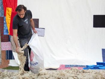 Идея художника из США Самвела Сагатеряна - собрать под одним одеялом всех людей, все страны мира. По его словам, огромное одеяло, которое он сшил из цветных лоскутков ткани, создано для большой и сплоченной семьи.