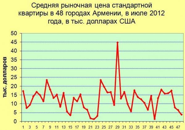 Во втором и третьем по значению, после столицы, городах цены не соответствуют их статусу. В Гюмри средняя рыночная цена стандартной квартиры составляла в июле $17 тыс., а в Ванадзоре и того ниже – $13 тыс. Отметим, что простая среднеарифметическая цена стандартной квартиры по 48 городам провинции в июле составила $13 тыс.