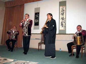 После коротких приветственных речей на сцену поднялась девушка в японском кимоно, церемонно поклонилась и принялась выводить сложнейшие иероглифы. Но, когда она заговорила на чистейшем русском языке, присутствующие заметили, что внешность у нее абсолютно славянская. Позже выяснилось, что тут нет никакой игры природы - Екатерина Назарова, уроженка Сахалина, обучалась японскому языку в университете, затем уехала в Японию на стажировку, вышла замуж и осталась в Стране восходящего солнца навсегда. Там же обучилась в совершенстве владению кистью и теперь не хуже японских мастеров выписывает иероглифы. На протяжении всего концерта она демонстрировала выведенные ею на рисовой бумаге замысловатые японские буквы, сопровождая их создание весьма интересными и доходчивыми рассказами. Да так, что к концу концерта зрители уже пытались сами догадываться, что именно на сей раз написала Екатерина.