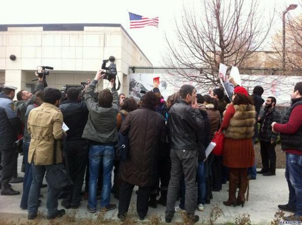 Перед посольством США в Ереване 4 марта гражданские активисты провели акцию протеста. Участники акции выступали против поздравления Сержа Саргсяна президентом США Бараком Обрамой в связи с переизбранием первого на посту главы государства.
