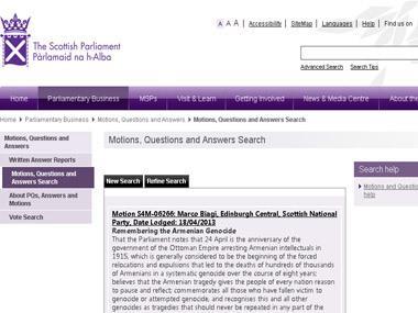 Парламент Шотландии объявил 24 апреля днем памяти жертв Геноцида армян. Автором законопроекта, за принятие которого высказались 67 парламентариев, является член парламента Шотландии Марко Биаги (Marco Biagi).