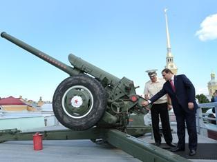 После этого принимающая сторона пригласила гостя на Нарышкинскую башню, откуда с петровских времен ежедневно пушечным залпом знаменуется полдень. Время от времени право осуществить залп предоставляется почетным гостям города. 3 июля этой чести удостоился Тарон Маркарян.