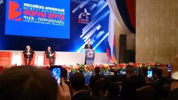 В евразийской интеграционной новейшей истории произошло заметное, если не сказать знаковое событие - в Гюмри и Ереване состоялся российско-армянский межрегиональный форум 2013. Организаторами форума стали Администрации Президентов Армении и России. Сразу следует сказать, что Форум удался. Его отличала многолюдность, тематическое разнообразие (одних только круглых столов по 9-ти направлениям), наполненность культурными акциями (открытие памятника Дружбы армянского и русского народов, гала концерт классической музыки с участием российских и армянских певцов и музыкантов) и символическими действами, к числу которых следует отнести открытие парламентского клуба друзей России и Белоруссии. Регионы, ради которых, собственно, Форум и проводился, также смогли пообщаться и наладить контакты. Для этого действовала двухдневная выставка, на которой регионы России и Армении в павильоне «Ереван-Экспо» демонстрировали свои достижения и показывали товар лицом. Чего здесь только не было. Фруктово-коньячное изобилие армянских сельхозпроизводителей соседствовало с образцами оптового волокна из Саранска. Бортпроводницы РЖД воплощали красоту и респектабельность российской транспортной кампании, а красавицы в фирменных платьях ВТБ символизировали успех и перспективы одного из столпов российской банковской системы. Изделия армянских каменотесов возвышались над стопками книг, в которых освещались проблемы изучения русского языка и инвестиционной привлекательности Армении.