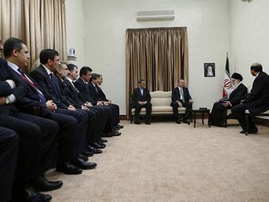2. В узком помещении турецкие министры кое-как тесной кучкой расселись перед аятоллой Али Хаменеи.