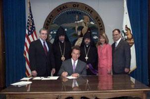 В 2006 году он подписал законопроект о возведении в административном центре штата городе Сакраменто Мемориала памяти жертв Геноцида армян 1915-1923 гг. «Мы никогда не забудем бесчеловечность и безжалостность, допущенные во время Геноцида армян. Этот мемориал будет напоминать калифорнийцам о тех невыносимых страданиях, которым подверглись жертвы»; — сказал Шварценеггер в своем послании. В 2008 году, он вновь выступил с заявлением к армянской общине: «Растущее армянское население нашего штата — самая большая армянская диаспора оставила неизгладимый след в истории, производстве и культуре Калифорнии. В 1915-1923 годах более миллиона армян было убито на территории Османской Империи и очень многие потеряли все, что имели. Женщины и мужчины, дети и старики стали жертвами этого ужасного преступления. Часто квалифицируемый как первый Геноцид 20-го века, это событие изменило жизнь многих людей и дало начало образованию Армянской Диаспоры. Калифорния гарантирует, что жертвы Геноцида армян не будут забыты. Таким образом, я, Арнольд Шварценеггер, губернатор штата Калифорния, объявляют 20-27 апреля 2008 года Днями памяти жертв Геноцида армян».