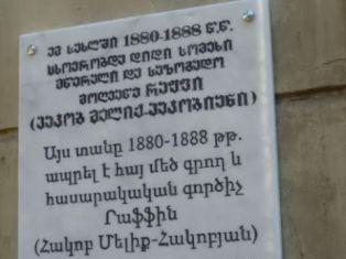 В Тбилиси установили мемориальную доску на доме, в котором проживал выдающийся армянский писатель и общественный деятель Раффи (Акоп Мелик-Акопян). Церемония открытия мемориальной доски состоялась 13 марта по инициативе посольства Армении в Грузии.