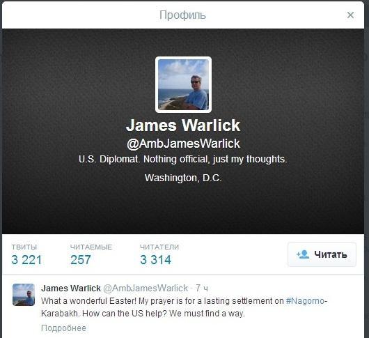 "В это прекрасный праздник Пасхи я молюсь об урегулировании конфликта в Нагорном Карабахе", - написал на своей странице в Twitter американский сопредседатель Минской группы ОБСЕ Джеймс Уорлик (James Warlick), передает корреспондент ИА REGNUM.