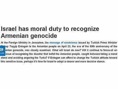 Согласно статье, МИД Израиля внимательно изучило заявление премьер-министра Турции Реджепа Тайипа Эрдогана, обнародованное 23 апреля – накануне 99-й годовщины Геноцида армян.
