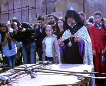 НА КАМЕННЫЙ ПОСТАМЕНТ БЫЛ ВОДРУЖЕН КРЕСТ. После ритуала освящения креста все участники мероприятия спешили приложиться к символу христианства. Затем крест был поднят вверх и установлен на сияющий под лучами солнца купол церкви. Из храма раздалось песнопение в исполнении детского хора школы искусств общин Алаверды и Одзуна. Духовная музыка разлилась по лорийским горам и ущельям. У фронтальной стены храма школьники устроили выставку рисунков. Пейзажи, натюрморты, герои Священного писания и, конечно, знаменитая Одзунская церковь глазами детей выглядели потрясающе.
