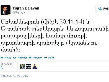 «Черногория (до 30.11.14) и Албания сообщили об отмене визовых требований для граждан Армении»,– написал он.