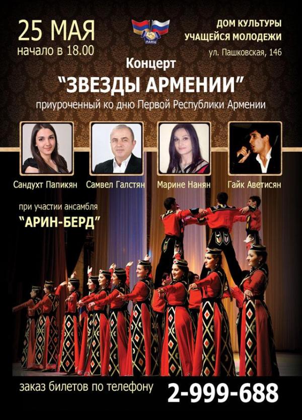 25 мая в Краснодаре состоится концерт народного ансамбля армянского танца «Арин-Берд» и известных народных певцов из Армении (Сандухт Папикян, Самвел Галстян, Марине Нанян, Гайк Аветисян), приуроченный ко Дню Первой Республики Армения – Дню восстановления армянской государственности. Концерт пройдет в Доме Культуры Учащейся Молодежи по адресу: ул. Пашковская, 146. Начало в 18.00. Заказ билетов по телефону 2-999-688.