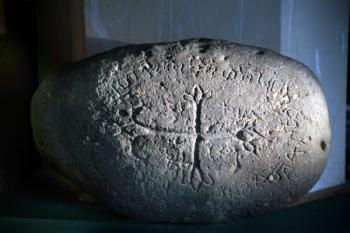 Это огромный валун, который с трудом могут передвинуть несколько человек. Впервые за столько лет камень вновь увидел дневной свет. Он лежал в слабо освещенном помещении, но армянские письмена выделяются четко. Особенно ярко смотрится слово "епископос". Камень обрамлен сирийским переводом надписи: "Иисус Христос, Господь Бог. Владыка Иоанн, армянский епископ. В 772 году сделана эта надпись летосчисления армянского".