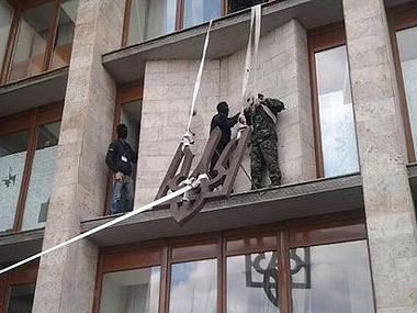 В Луганске представители т.н. «Ополчения» убирают украинскую символику: с помощью болгарки они спиливают гербы Украины с ворот здания областной администрации. Об этом сообщает РИА Новости.