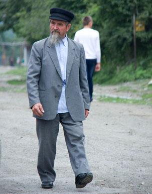 Через все село тянутся люди разных возрастов. Женщины в светлых платьях или юбках, в косынках. Мужчины в рубашках, с русским вышитым поясом, с длинными бородами. То и дело слышится «Здаров».