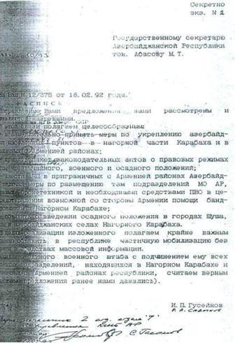 Это написанное 22 февраля 1992 года письмо председателя МНБ Азербайджана И. Гусейнова государственному секретарю этой республики М. Абасову, в котором излагается план уничтожения Республики Арцах.