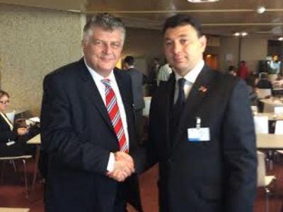 Находящийся с рабочим визитом в Женеве вице-спикер парламента Эдуард Шармазанов в рамках 131-ой Ассамблеи Межпарламентского союза встретился с членом парламента Греции, главой греческой делегации в Межпарламентском союзе Георгиосом Константуполосом.