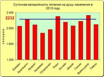 В стране превышение суточной нормы имелось только по двум областям – в Вайоц Дзоре (на 100 килокалорий) и Лори (на 71 килокалорию). Заметим, что по уровню денежных доходов лидируют не эти области, а «голодные» Сюник и столица. По показателю валовой сельскохозяйственной продукции на душу населения «рекордсмены по питанию» также не выделяются. Лори находится в рядах аутсайдеров в стране, а Вайоц Дзор занимает средние строчки. Каким образом эти области достигли столь выдающихся достижений в калорийности питании, остается лишь гадать.