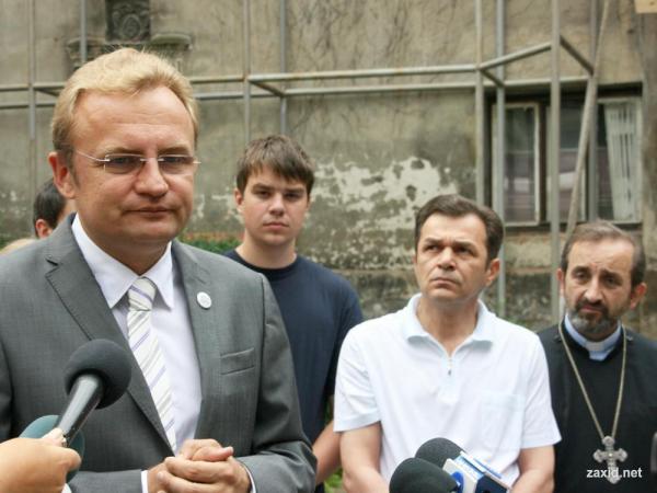На снимке: Мэр г.Львова Андрей Садовой, депутат горсовета Вардкес Арзуманян и настоятель отец Тадеос во дворе армянского кафедрального собора Львова