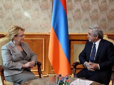 Президент Армении Серж Саргсян принял 8 ноября российскую делегацию во главе с министром здравоохранения России Вероникой Скворцовой, прибывшую в Армению для участия в первом армяно-российский здравоохранительном форуме.