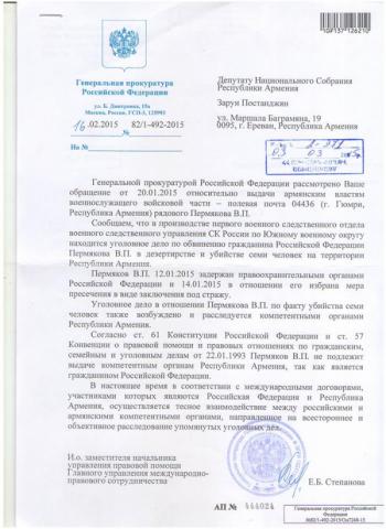 Генпрокуратура России ответила на письмо, адресованное президенту РФ Владимиру Путину депутатом парламента Армении от оппозиционной фракции «Наследие» Заруи Постанджян, в котором содержалось требование передать правоохранительным органам РА обвиняемого в убийстве семьи Аветисянов в Гюмри – военнослужащего срочной службы 102-й РВБ Валерия Пермякова. Об этом сообщает пресс-служба фракции «Наследие» и предоставляет сканированный ответ Генеральной прокуратуры РФ, который размещаем ниже.