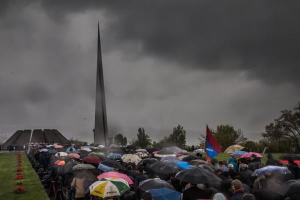 В Ереване дождь. Мокнут тюльпаны, гвоздики и гроздья сирени в руках людей. Мокнут вырезанные из бумаги фиолетовые незабудки на пиджаках и платьях. «Незабудка» по-армянски — тоже про незабвенное. Чтобы пройти к Вечному огню, нужно отстоять очередь под открытым небом. Толпа в мемориальном комплексе «Цицернакаберд» ощетинивается зонтами, но никто никуда не уходит. Сегодня люди чувствуют необходимость быть здесь.
