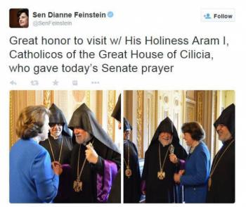 НА ФОТО: Сообщение в Твиттере сенатора Дайан Фенштейн (Dianne Feistei) о встрече с Католикосом Арамом I