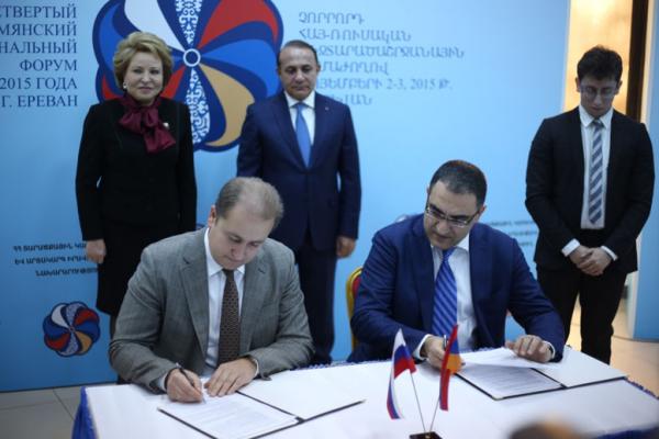 В Ереване в рамках работы IV российско-армянского межрегионального форума «Россия. Армения. Евразийский экономический союз. Новые перспективы межрегионального сотрудничества» состоялось подписание Договора о совместной деятельности между Межгосударственной корпорацией развития (Россия) и Российско-Армянским (Славянским) Университетом (Республика Армения).